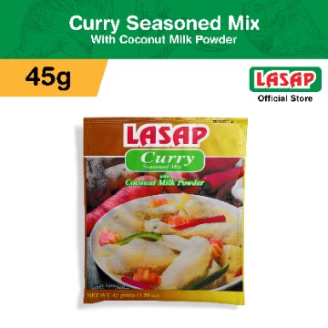 Lasap Curry Seasoned Mix 45g with Coconut Milk Powder! For a Pinoy Curry-licious dish! Suggested Receipe: Directions 1. Dissolve Lasap Curry Mix Powder in 1 1/4 cups of water. Set aside. 2. Fry 1/2kg of meat in oil (medium cooked) 3. Pour in the dissolved curry mix. Put in potatoes and carrots. (Optional) 4. Cook over medium heat until done 5. Add in red bell pepper (optional) until sauce thickens